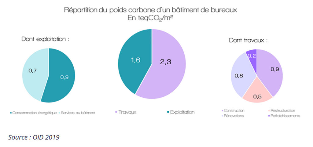 L’Observatoire de l’Immobilier Durable (OID) a réalisé une étude récente qui annonce plutôt un chiffre de 3,9 tonnes équivalent CO2 par m2, dont 2,3 tonnes équivalent CO2 seraient dues aux seuls travaux !