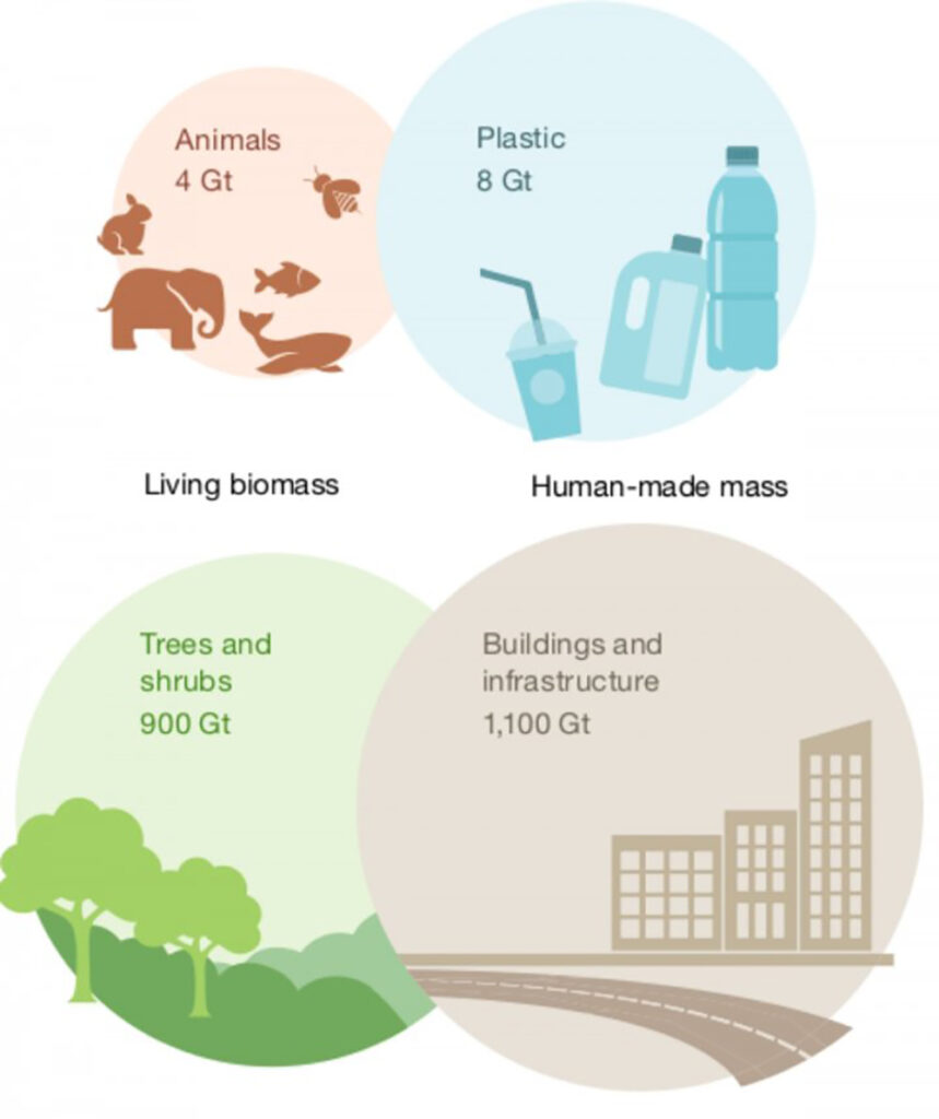 Comparaison des masses d’origine anthropique à la biomasse vue dans Global human-made mass exceeds all living biomass, Nature, décembre 2020